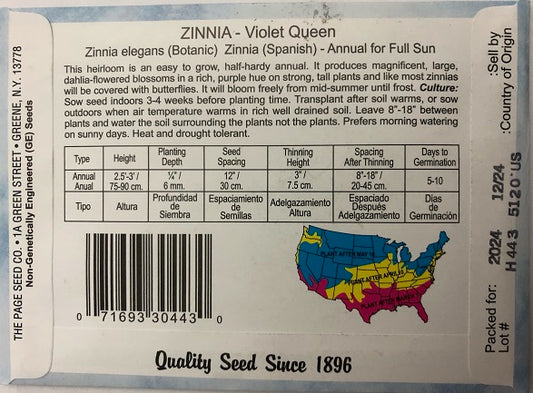 ZINNIA - VIOLET QUEEN 500MG HEIRLOOM NON GMO