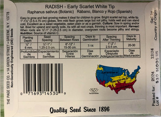 RADISH - EARLY SCARLET WHITE TIP 4G HEIRLOOM NON GMO