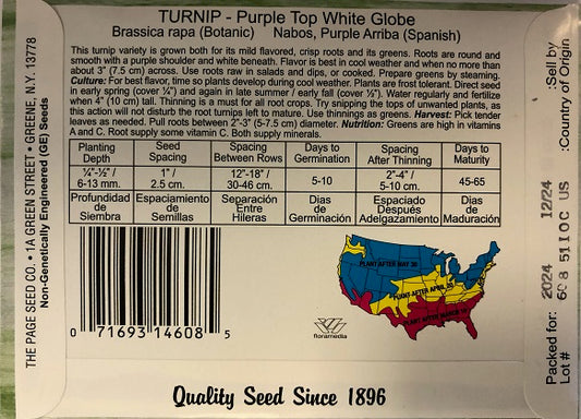 TURNIP - PURPLE TOP WHITE GLOBE 4G HEIRLOOM NON GMO
