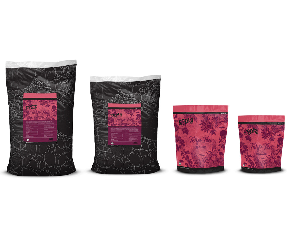 Roots Organics Terp Tea Bloom delivers critical nutrition for heavy-feeding, high-yield plants. Recommended for both large and small-scale gardens, this high-quality dry fertilizer is simple, comprehensive, and completely natural. Our powerful one-part grow and one-part bloom formula can serve as base nutrition or as a supplement, and can be delivered in large batches or controlled point feedings. Amend any potting soil with this micronized flowering nutrient to feed the natural terpene power of your aromatic plants.