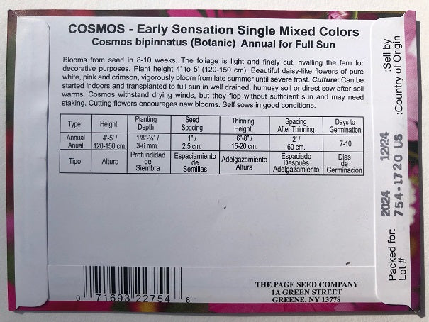 Blooms from seed in 8-10 weeks. The foliage is light and finely cut rivalling the fern for decorative purposes. plant height 4' to 5'. beautiful daisy-like flowers of pure white, pink and crimson, vigorously bloom from late summer until severe frost.