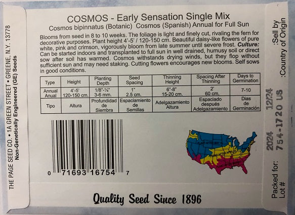 COSMOS - EARLY SENSATION MIXED COLORS 900MG HEIRLOOM NON GMO