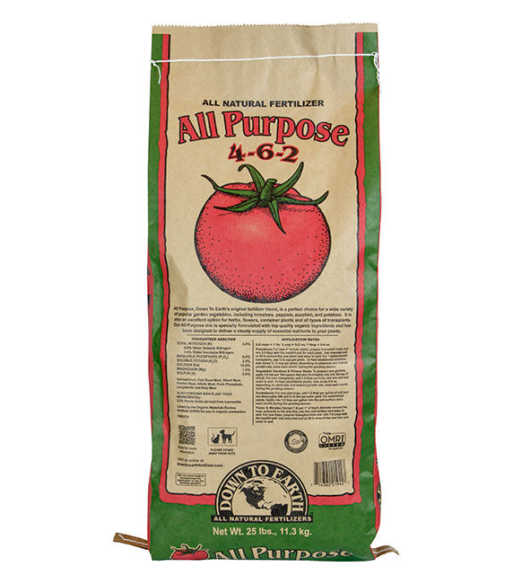 Down To Earth’s All Purpose 4-6-2 mix is ideal for all types of transplants. A gentle, non-burning fertilizer made for vegetables, herbs, flowers and container plants, it is formulated with top-quality organic ingredients and designed to deliver a steady supply of essential nutrients to your plants while enhancing soil fertility and microbial activity naturally.