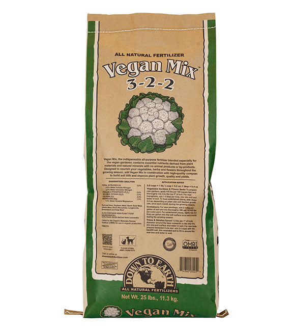 Down To Earth’s Vegan Mix 3-2-2 contains essential nutrients derived from plant materials and natural minerals, with no animal products or by-products. Designed to continually nourish your vegetables, herbs and flowers throughout the growing season, add DTE Vegan Mix 3-2-2 in combination with high-quality compost to build soil tilth and improve plant growth, quality and yields.