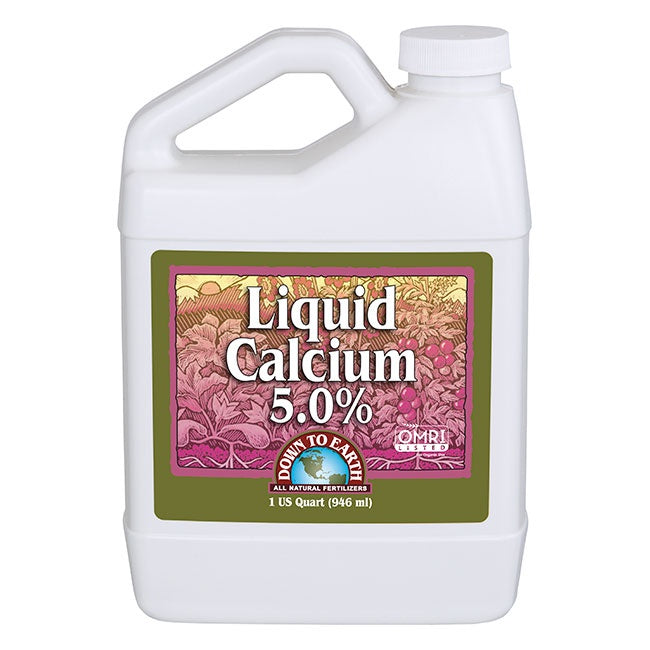Down To Earth’s Liquid Calcium 5% is an essential nutrient that plays many important roles in plant growth. DTE Calcium is needed for cell wall formation, normal cell division in new growth and proper fruit development. Calcium deficiency can result in poor root development, yellowing of new plant tissue and fruit and vegetable abnormalities, such as blossom end rot in tomatoes. Foliar additions of calcium can be used to correct or prevent deficiencies of this valuable nutrient.