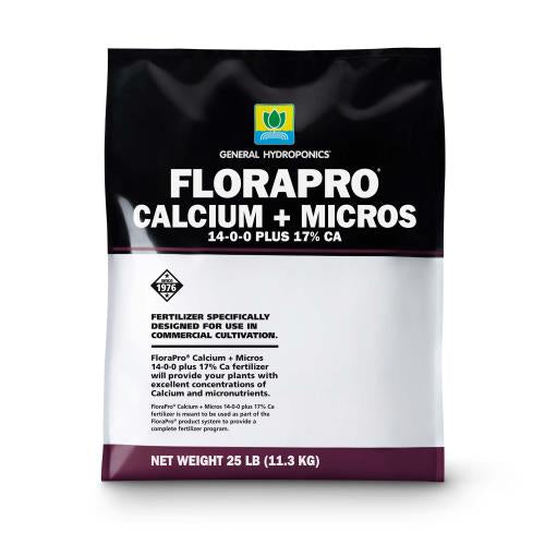 Specifically designed for use in commercial cultivation. FloraPro Calcium+Micros 14-0-0 plus 17% Ca fertilizer will provide your plants with excellent concentrations of Calcium and micronutrients. FloraPro Calcium + Micros 14-0-0 plus 17% Ca is meant to be used as part of the FloraPro product system to provide a complete fertilizer program.
