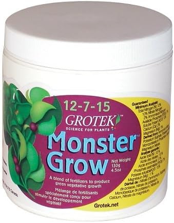 Monster Grow is a high nitrogen fuel for high performance growing that gives an added boost to your plants while they are in the vegetative stage. It is designed to be used only once to give your plants an additional push to produce extra lush green vegetative growth.