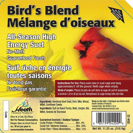 Heath Suet Cakes are produced by blending the highest quality natural ingredients available. Suet cakes are ideal for attracting colorful songbirds. Instructions for use: Place suet cake in suet cage and hang approximately 6ft off ground. Refill cage when empty.
