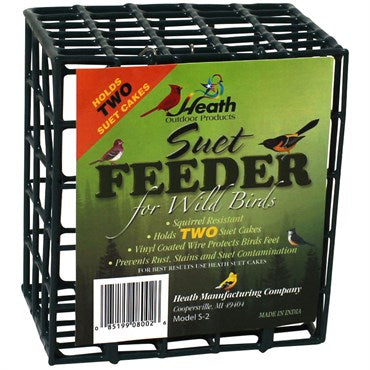 Vinyl coated metal cage is weather resistant and designed to hold two standard size suet or seed cake to feed a variety of songbirds. The front panel opens for easy filling and birds are able to feed from all surfaces. Hanging chain attached.
