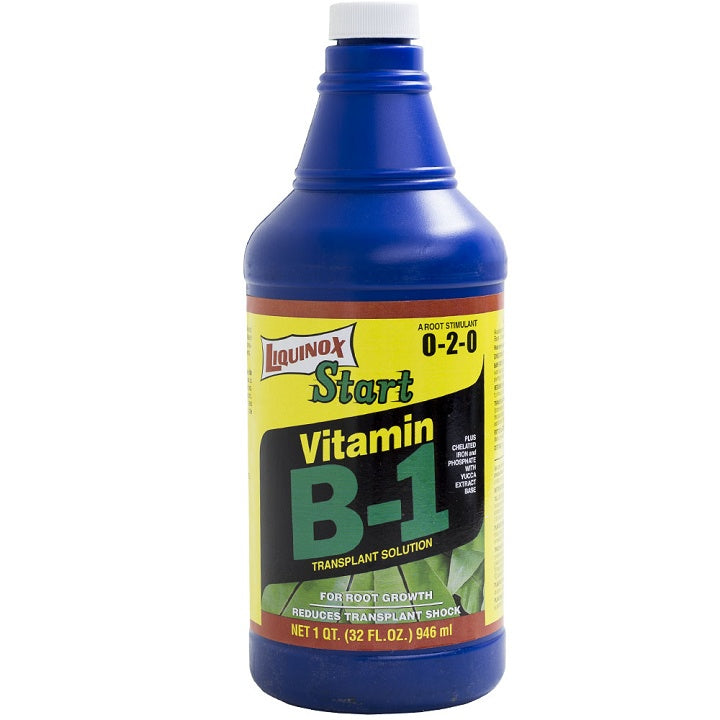 A transplant solution of growth-promoting substances that includes vitamin B-1, alpha naphthalene acetic acid (hormone-like substance), yucca extract base, chelated iron and phosphoric acid. Liquinox Start is specially formulated to help reduce transplant shock and to stimulate feeder root growth. It is an ideal transplant solution for use on all types of transplants, including bare root roses, shrubs, bedding plants, seedlings and cuttings. Light frequent applications of Liquinox Start will result in good, healthy root structure and successful planting. Ingredients: phosphoric acid, ferric EDTA. Contains non-plant food ingredients: 0.10% vitamin B-1 (thiamine mononitrate), 0.10% Yucca extract.