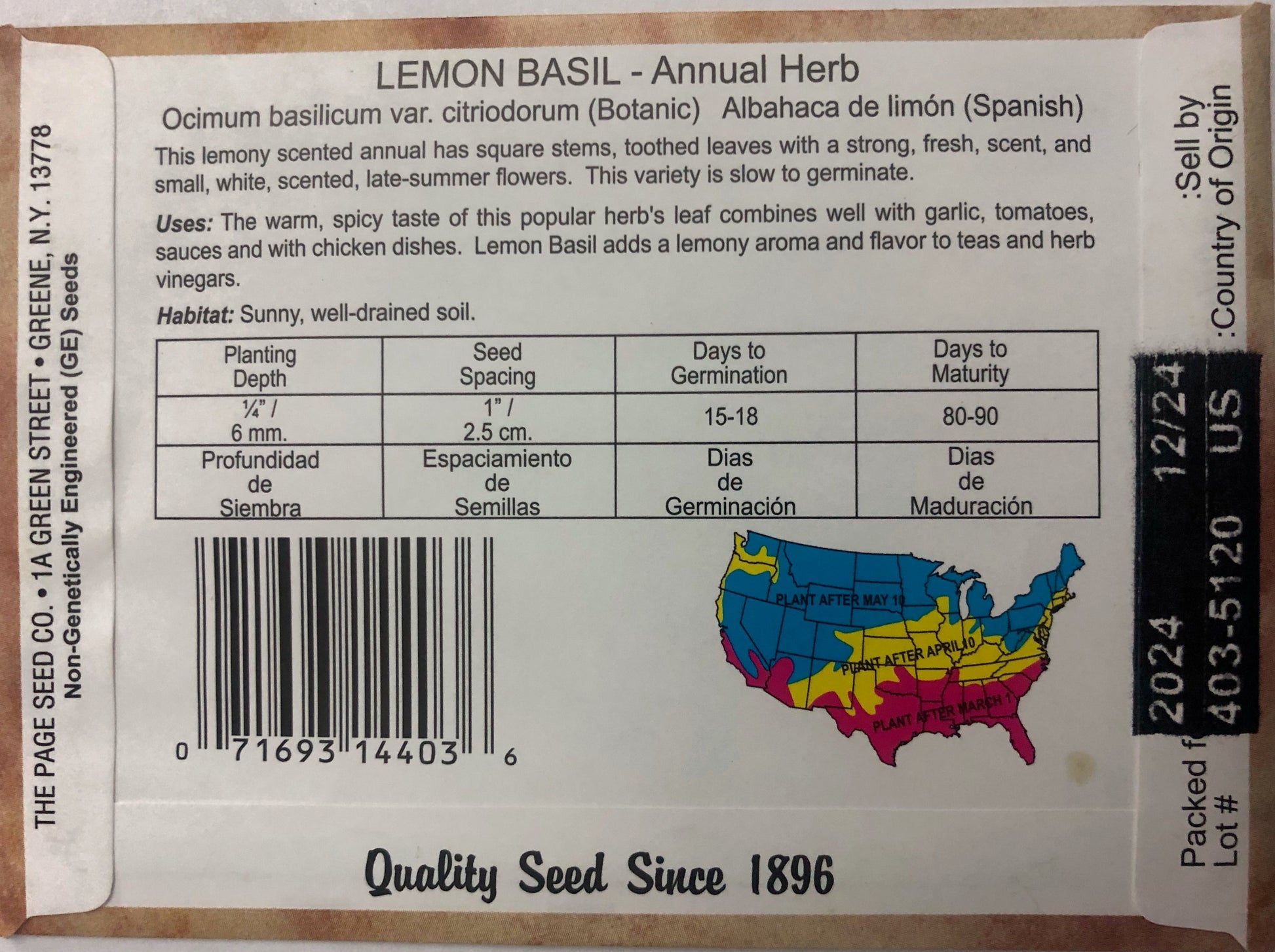 Lemony scented green leaves, white flowers. Adds a lemony aroma and flavor to teas, chicken, fish and vegetables. Used in making herb vinegars. This warm weather annual grows bushy and about 12″ tall.