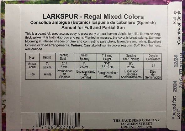 This is a beautiful spectacular easy to grow early annual having delphinium like florets on long thick spike. It is both vigorous and early. Planted in masses the color is breathtaking. Summer blooming in intense shades of blue and contrasting pale pinks, lavenders and white. Excellent for fresh or dried arrangements.