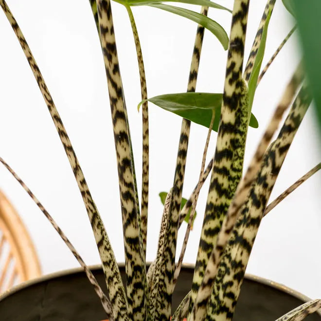 Unlike its Alocasia genus relatives, the Alocasia Zebrina is not prized for its foliage; its unique zebra-like stems are what steal the show. Besides its unique stem, this exotic plant has dark green leaves and will surely add character and personality to any space in your home.