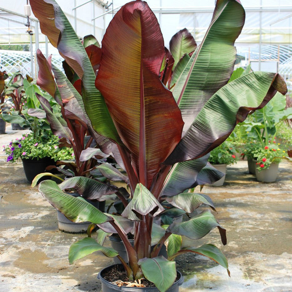 We have long been amazed by Ensete maurelii, an outstanding ornamental banana from the high mountains of East Africa. Growing to only 10' tall in temperate climates (20' tall in tropical areas), Ensete maurelii makes a superb ornamental for the summer border. Each leaf can reach gigantic proportions of 10' long. The most ornamental characteristic is that the foliage is flushed with burgundy, especially concentrated as the new growth emerges. The higher the light levels, the stronger the coloration. We have also seen Ensete maurelii used in large summer containers with great effect. All ensetes are non-offsetting monocarpic plants...they die after they flower. If you've ever seen the magnificent flower, it's well worth the loss.