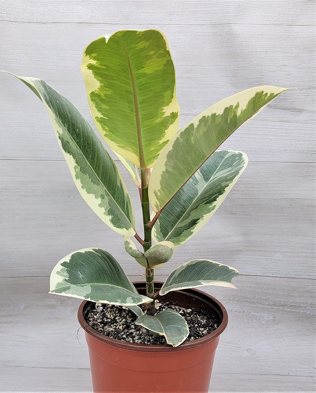 As far as tropical houseplants go, one of the most popular and easy-to-grow species is the rubber plant (Ficus elastica). Their oversized, glossy green oval leaves make a statement in any bright, warm room. If you want to make even more of an impression, opt for the easy-to-find cultivar ficus tineke (Ficus elastica 'Tineke'). The variegated rubber plant, as it's sometimes known, often features striking reddish-pink tones on the outside of the green and cream foliage, and the sheath at the top of the stem is also a deep burgundy-red color.