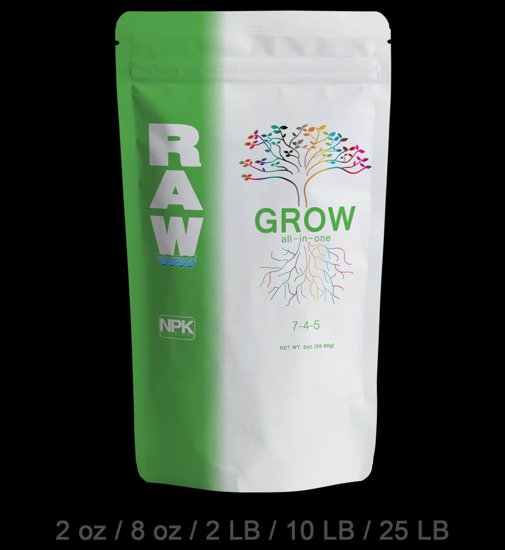 RAW GROW is a tested blend of all 12 RAW Soluble plant nutrients, essential elements and supplements. This blend has been proven to be an optimal all-in-one base “Grow” horticultural fertilizer. RAW GROW is used through out the entire vegetative stage. Derived from: Plant protein hydrolysate, mono potassium phosphate, potassium sulfate, cane molasses, sodium borate, copper sulfate, iron DTPA, magnesium sulfate, manganese sulfate, zinc sulfate and azomite. Also contains non-plant food ingredients: Humic acids derived from leonardite and peat, kelp (ascophyllum nodosum), silicon dioxide derived from diatomite and yucca extract.
