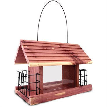 Pennington Cedar Grand Snack Shack Bird Feeder is constructed from Eastern Red Cedar, nature's renewable resource, and is naturally resistant to weather and insects. Pennington Cedar Grand Snack Shack Bird Feeder an attractive hopper style feeder with attached suet baskets, allows for simple feeding of seed and suet from one feeder that attracts a wide variety of colorful songbirds to your backyard. Pennington Cedar Grand Snack Shack Bird Feeder is easy to fill and ready to hang with weather resistant hanging cable.