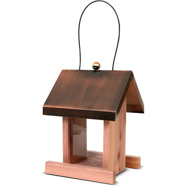 Pennington Cedar Copper Roof Villa Bird Feeder is constructed from beautiful, renewable, weather-resistant eastern red cedar and has a decorative copper roof. This hopper style feeder is ideal for attracting a variety of smaller songbirds and allows for feeding of all seed types. Easy to fill and ready to hang with chew-proof cable.