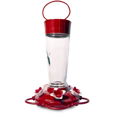 Pennington Pride Glass Hummingbird feeder in its bright red color will attract multitudes of hummingbirds to your backyard. It features 5 flower shaped feeding ports with flip perches arranged in a circular manner to accommodate multiple hummingbirds all at one time. The flip perches provide a place for hummingbirds to rest while they eat. The top has a built-in ant moat to help repel ants. Simply fill the top with water and drive away any approaching bugs. The heavy-duty glass bottle holds up to 10 ounces of nectar and has a wide opening for easy filling and cleaning. The base easily disassembles for easy cleaning. A red vinyl hanging wire is included to hang anywhere in your back yard.