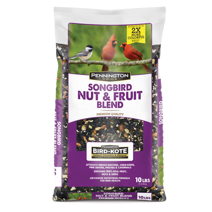 Pennington Pride Songbird Nut & Fruit Blend attracts up to two times more colorful songbirds to your feeders. This appealing, premium mix of healthful seeds, grains, nuts and fruit pieces is fortified with nutrients for the bird's health. Pennington Pride Songbird Nut & Fruit Blend contains 100% real fruit, nuts, and seeds. This high energy, nutritious blend is ideal for year-round feeding. Pennington Pride Songbird Nut & Fruit Blend attracts the most popular birds, including Chickadees, Pine Siskins, Indigo Buntings, Purple Finches, Cardinals and many more. It is ideal seed blend for all hopper, tube, and tray style bird feeders.