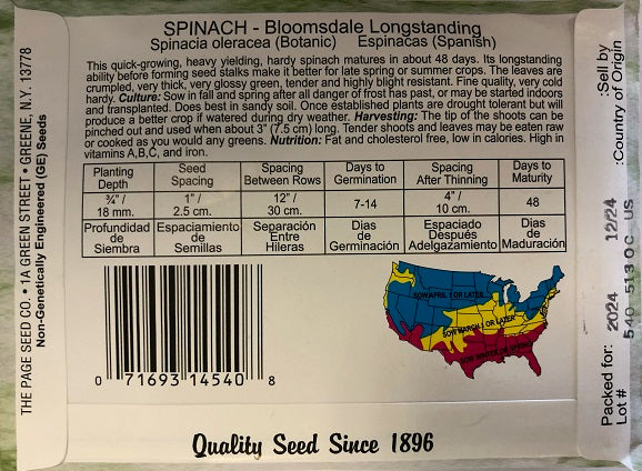 This quick-growing, heavy yielding, hardy spinach matures in about 48 days. Its longstanding ability before forming seed stalks make it better for late spring or summer crops. The leaves are crumpled, very thick, very glossy green, tender and highly blight resistant. Fine quality, very cold hard.