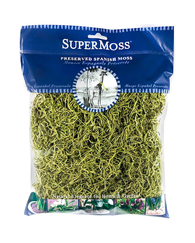 SuperMoss Preserved Spanish Moss is a company staple. It grows in a swirly, spaghetti-like fashion and makes for an excellent touch to floral displays, creative projects, and your garden. Our product is responsibly procured and comes in its natural color as well as a variety of enhanced colors to match your home decor. Our product is durable and reliable to provide long-lasting beauty. It is ideal for covering soil or dressing container plants, bulbs & orchids. Spanish Moss is also a great natural fill for gift baskets. *Cleaned before packaging to remove small particles. Available in SuperMoss packaging or in bulk quantities. Spanish Moss is also available 'Dried' for a more natural look.