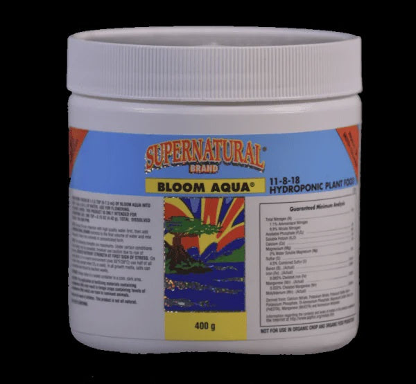 SUPERNATURAL BRAND BLOOM AQUA Is used during the flowering stage in hydroponics to promote beautiful blooms. Bloom Aqua contains essential minerals and trace elements to support vigorous flowering. Bloom Aqua also contains 8% calcium which allows you to do without a calcium supplement and still achieve healthy, vigorous flowering growth.